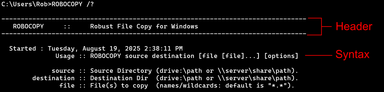 We already knew about the ROBOCOPY source destination part, though notice that here, the destination is required whereas it was optional in XCOPY