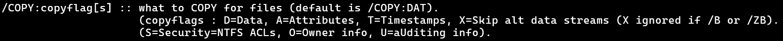 It says this option tells ROBOCOPY what to copy for files. By default, the option is /COPY:DAT, as confirmed when running the commands we have been doing, or looking at the help description.