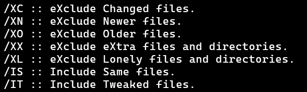 The image shows how the help describes these options, and there isn't too much else to say about them beyond what it does. All four options are used to exclude files.