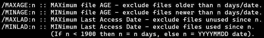 For example, /MAXAGE:10 sets the maximum age of files to be copied to be 10 days. So if a file is 9 days old, it gets copied. A file that is 11 days old is older than the maximum of 10, so gets excluded.