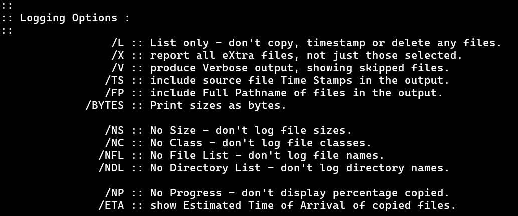 Maybe you want to be able to look back at the files and folders that were copied, skipped, extras, or whatever else after the program has finished and you close the window. Or maybe you just want a log that is more easily searchable than having to manually search the log by eye in the command prompt. In that case, you want to save the log in a log file.